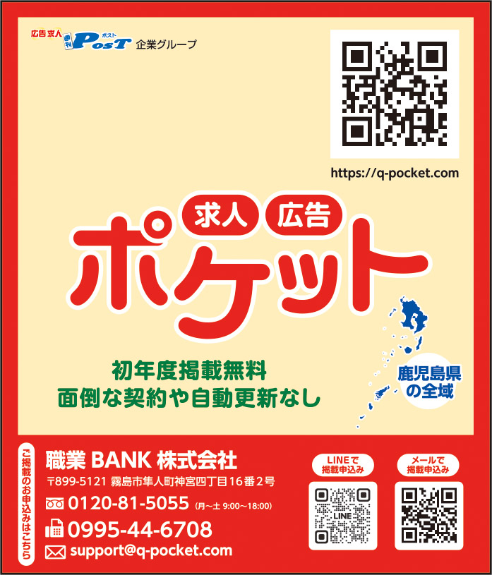 「求人情報誌POST」は、正社員・アルバイト・パート・契約社員はもちろん、派遣社員・業務委託などさまざまな職種や雇用形態の求人募集を満載です。鹿児島県内の求人情報はもちろん、県外からの求人募集も数多く掲載しています。「求人誌POST」は毎週土曜日発行予定のフリーペーパーです。コンビニエンスストア、スーパーさんをはじめ、人の多く集まるお店に設置頂いております。